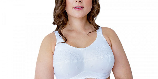 Удобный бюстгальтер для фиксации протеза молочной железы белого цвета, с высокой линией декольте.